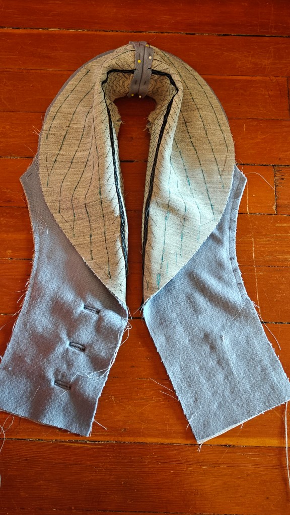 The main wool fabric was sewn based on the pattern, with horsehair canvas for the interfacing. I used Gertie’s previous blog posts here for some tips on how to do this step. I did a lazy form of padstitching, with quite large stitches, mainly to attach the interfacing to the fabric. It worked, so I would say it was a success.