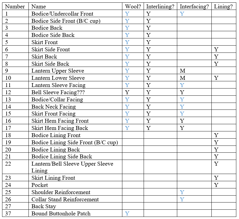 I spent about 50 hours on it. This was partially due to how many pattern pieces there were (like 52???), which needed to be cut out of three different fabrics, with different variations. Here is an actual table I used to keep track of the pieces I was cutting out. And I was an absolute beginner with some of these techniques, such as tailoring and coat construction.